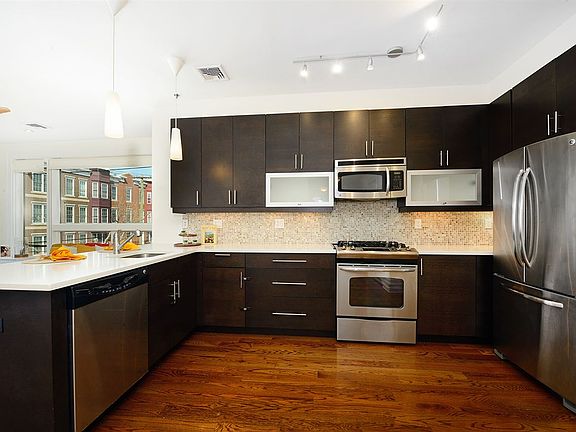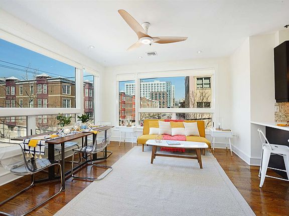 Immaculate corner condo flooded with light in steel-and-concrete elevator building with on-site parking and two shared outdoor spaces. Open chef's kitchen features espresso custom cabinets, glass tile backsplash, stainless steel appliances, quartz countertop and breakfast bar. Ample living space accommodates formal dining in addition to a large sitting area enjoying two 'walls of windows', recessed lighting, hardwood floors and Haiku ceiling fan. Master bedroom offers another over-sized triple window, great closet space and en suite bath with Porcelanosa tiles and fixtures. Large second bedroom features more great light, a large double closet and direct access to a 'Jack & Jill' full bathroom with frameless 'barn door' glass shower enclosure. Enjoy central heat and air, laundry in home and two shared outdoor spaces, one on the second floor perfect for grilling and relaxing, one on the rooftop where gardens are active and city views impress. All this close to some of Hoboken's best shopping and dining and a stone's throw from '700 Jackson' - Hoboken's newest 2 acre park complete with children's play area, community gym and pedestrian plaza. Of course, easy transport in NYC via Path, Ferry or Bus.