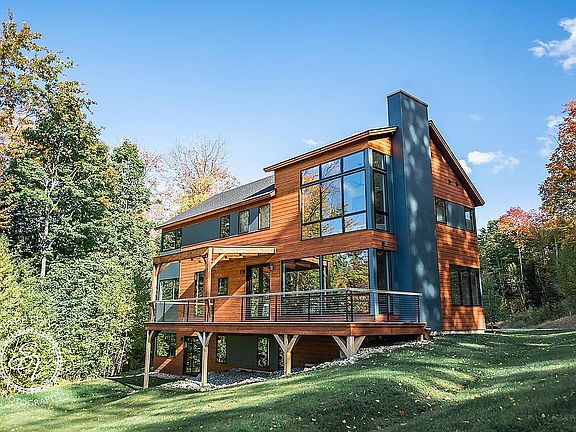 Custom-designed and built high up on a shoulder of Raven Hill, this mountain modern home features panoramic views of Mt. Mansfield or the Pinnacle from every room.