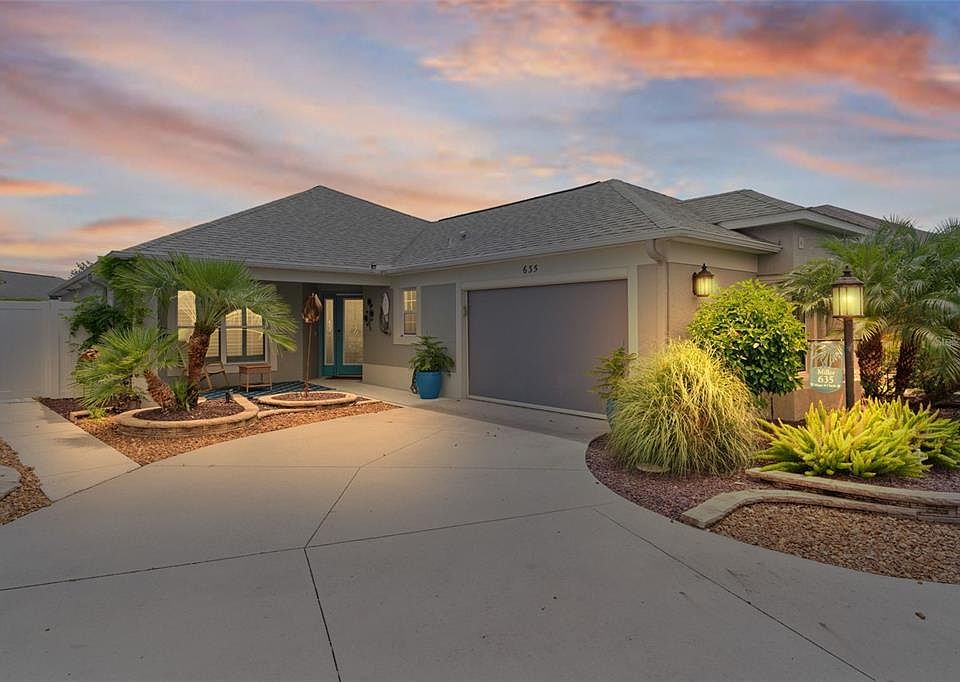 Exquisite WYNDHAM MODEL Oasis in Vibrant MISSION HILLS. Step through the shimmering CUT-GLASS DOORS into a world of timeless elegance & modern luxury with this breathtaking BLOCK & STUCCO home, perfectly poised in the heart of the sought-after Mission Hills community. Just a heartbeat from the lively pulse of LAKE SUMTER LANDING, Spanish Springs, Brownwood, and beyond, this home is your gateway to a life of sophistication and adventure. The OPEN FLOOR PLAN unfolds like a grand stage, where sunlight dances across PLANKED-STYLE TILED FLOORS. At the center, a GOURMET KITCHEN dazzles with a WRAP-AROUND BREAKFAST BAR that beckons morning coffee chats and PLUS A PREP ISLAND perfect for crafting culinary masterpieces. Gleaming STAINLESS STEEL APPLIANCES, including a sleek NEWER BOSCH DISHWASHER & whisper-quiet NEWER GARBAGE DISPOSAL, pair with UPGRADED FIXTURES, BEAUTIFUL COUNTER TOPS & lofty, VARIED HEIGHT CABINETS, creating an air of refined grandeur. Graceful ARCHWAYS weave a thread of CHARM through the home, guiding you to the crown jewel: STACKABLE SLIDING GLASS DOORS that vanish like magic, revealing a SPRAWLING 35x19 LANAI. Here, 18x18 TILES gleam underfoot, a 3-year-old HOT TUB hums invitingly, & a lush garden space blooms beside a captivating MURAL adorning the courtyard wall—a serene escape for starlit evenings or sun-soaked afternoons. A smart DRAINAGE SYSTEM stands guard against Florida’s seasonal storms, ensuring your outdoor haven remains pristine. This home is as practical as it is poetic, powered by CUTTING EDGE SOLAR PANELS working in harmony with a TESLA POWERWALL, ready to weather any storm with ECO-CONSCIOUS EFFICIENCY. An A/C SYSTEM(2YR) complete with a NEW AIR HANDLER, HEAT PUMP, and freshly cleaned vents, wraps you in cool comfort year-round. A RETRACTABLE SCREEN on the garage door adds effortless versatility. The garage has ample space for a car & golf cart. The primary suite is a sanctuary of indulgence, crowned with a soaring TRAY CEILINGS and anchored by a WALK-IN CLOSET meticulously organized for ease. The EN-SUITE BATHROOM is a SPA LIKE retreat, boasting DUAL SINKS, a RAINHEAD SHOWER that cascades like a gentle storm, and a PRIVATE WATER CLOSET with a bidet. PARTIALLY FURNISHED with curated, tasteful touches, this home invites your personal style while offering move-in-ready ease. STARLINK is available, adding a final flourish to this masterpiece. In Mission Hills, where charm meets convenience, this Wyndham model is more than a home—it’s a lifestyle. Seize the chance to live vividly. Schedule your private tour today!