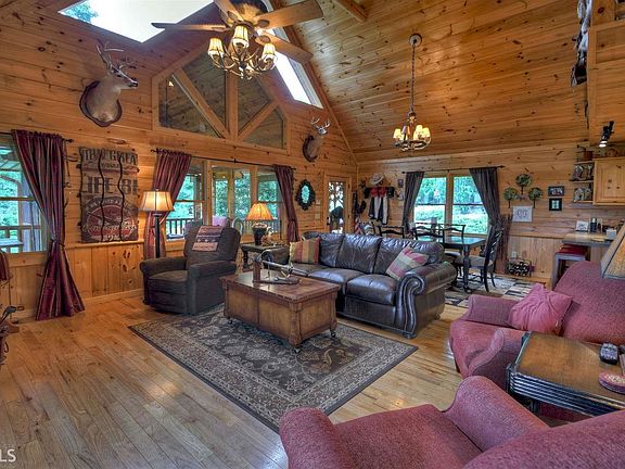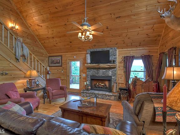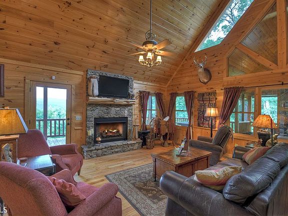 Breathtaking views from this amazing 3bed/3bath lodge! Step inside & let all of your stress melt away! Open living concept w/ a spacious great room, gorgeous rock fireplace, large kitchen & dining area. Main level bedroom w/ spectacular views & full bath. Top ten outdoor living space w/ covered porches, screened-in outdoor fireplace & ample space for entertaining! Large master suite w/ private covered porch & en-suite bath. Terrace level features a 3rd fireplace, living area, game area, full bath & bedroom. Large fenced in yard, fire pit area, storage shed/ workshop & mature landscaping. Private, yet easy paved access w/ plenty of parking & a circular driveway. Amazing location between Blue Ridge & Blairsville. Views from every room!! Great vaca rental!