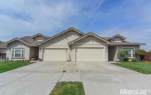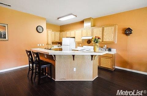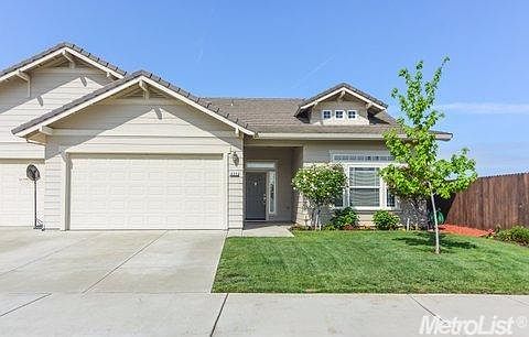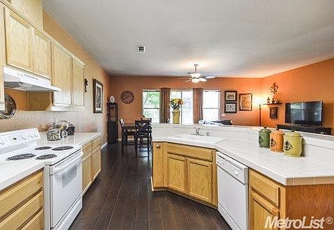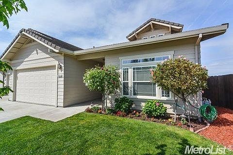 Wood laminate flooring in main living areas; carpet in bedrooms. Kitchen has tile counters, island & pantry. Great room slider to rear. Arched doorway to master. Master suite has walk-in closet & separate tub/shower. Three additional bedrooms and a full bathroom with dual sinks complete this home. Beautifully landscaped with large rear yard, patio and fruit trees. Garage has built-in shelving & laundry area. Ready for move in, this home is a must-see!