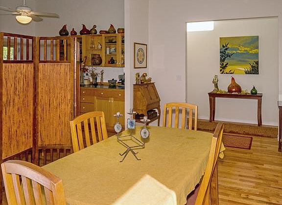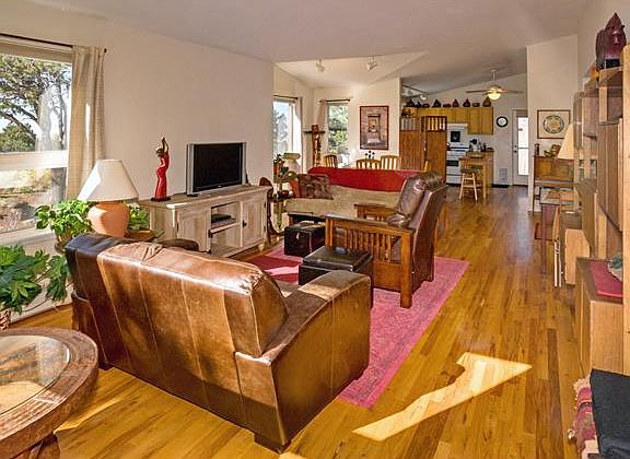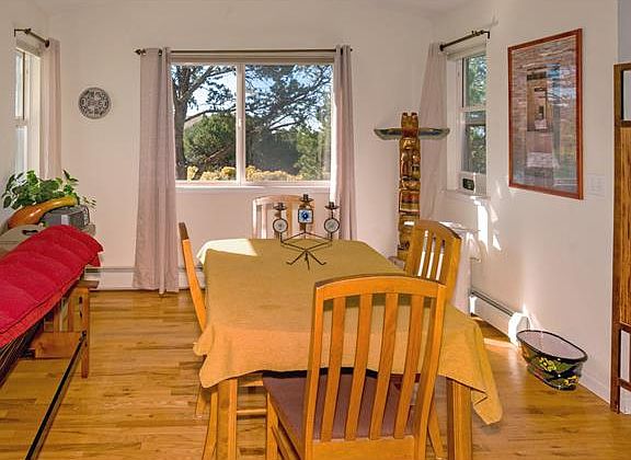 This lovely 3BD 1.75 BA 1504sf Terrapin home sits on 1.013 acres. The comfortable living/dining/kitchen are open and flowing with hardwood floors and lots of windows that provide abundant natural light. Clerestory windows facilitate passive solar gain and honeycomb blinds for energy savings. The extra large kitchen is well designed and has custom-made cabinets. One wing of the house offers a master bedroom and bath with shower and walk-in closet. The other side offers two additional bedrooms, one bath, a bonus studio room, a laundry area and plenty of storage. Solar panels are included although not currently in use.