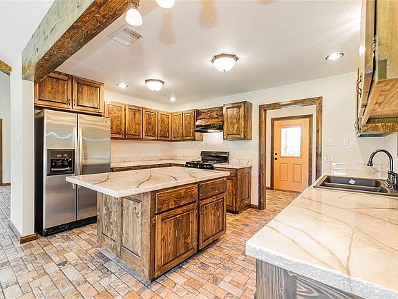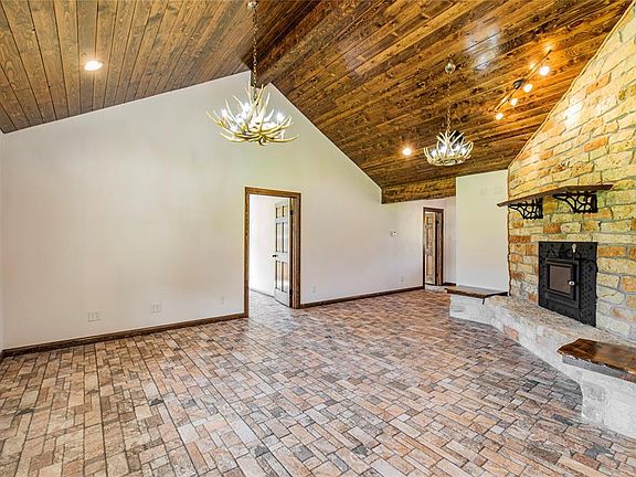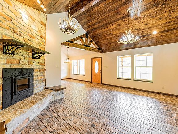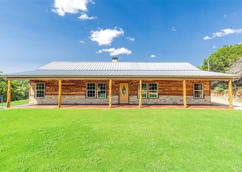 AWESOME BRAND NEW SECLUDED STONE & RED FIR CABIN IN THE WOODS WITH A POND on a TREED 7.42 ACRES! Beautiful custom finishes throughout the home including vaulted ceilings, exposed beams, antler chandeliers, porcelain tile throughout, and stained tongue and groove in the living room and master! Gorgeous concrete overlay marbled epoxy kitchen countertops! Fantastic 8x60 covered front and back porches on which to enjoy the rabbits and deer! Also includes a 35x60 commercial metal building with electric! One section is insulated with AC, offices and bathroom, which could be turned into an apartment and rented! One section is warehouse or shop with two 12 ft roll up doors. No other homes visible from the house!