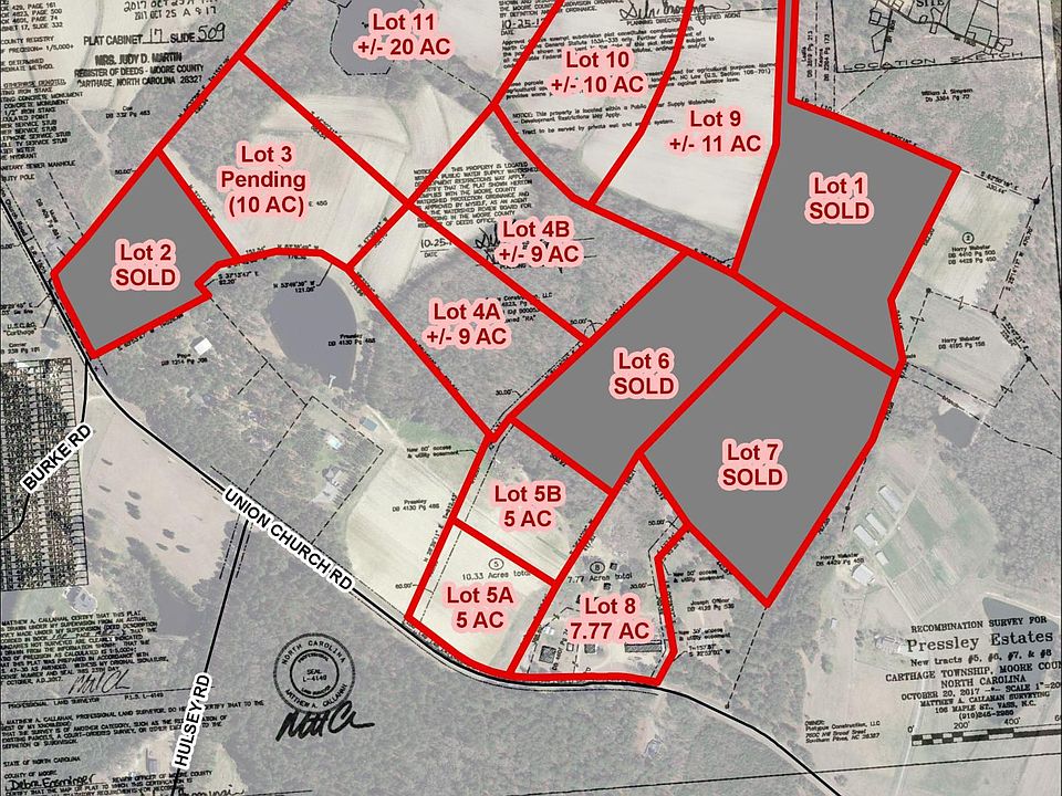 Looking for Acreage, look no further! Come build your Dream Home on this Beautiful 10 Acre Lot. Pressley Estates is a 136 Acre Tract Community with 5 Acre Lots and Larger. Easy Commutes to New Century and Union Pines High School. Local Carthage Grocery & Easy commute to Fort Bragg. No City Taxes only County Taxes that will be determined prior to closing. No HOA only minimal C&R's.