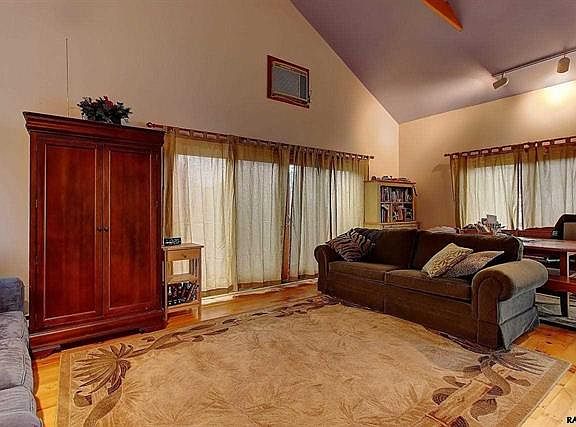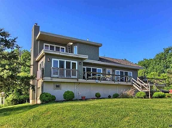 Vacation every day in this picturesque privacy! Spectacular home w/900' of frontage on the river and miles of panoramic views at the top! Awesome open floor plan w/vaulted and beamed ceilings, wood flrs., 2 fireplaces, most rooms feature sliding doors w/river view. Possible in-law qtrs. w/woodstove. Sauna. 2-car attached gar. w/workshop & detached 22 x 22 garage.