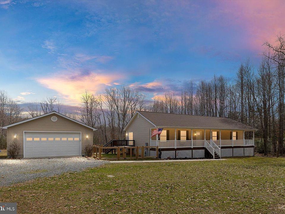 Escape to the perfect blend of country charm and modern comfort! This beautiful home sits on 7+ picturesque acres, offering the peaceful rural lifestyle you've been dreaming of—just a short drive to Lake Anna for endless outdoor adventures. A rocking chair front porch welcomes you inside, where a cathedral ceiling Great Room creates an airy, inviting space. The center island Kitchen with tile flooring flows seamlessly into a spacious Dining Area, perfect for gatherings. The Primary Retreat boasts a private bath, while two additional bedrooms and a full bath complete the main level. The walkout lower level expands your living space with a large Recreation Room, full bath, and a charming Bedroom (not to code) featuring a sliding barn door—plus a laundry area and huge unfinished storage space. Outside, enjoy summer fun in the above-ground pool with a floating deck, and store all your toys in the detached two-car garage. Need high speed internet, no problem! Starlink conveys! Whether you're looking for a private retreat or a homestead with room to roam, this incredible property is ready to welcome you home!