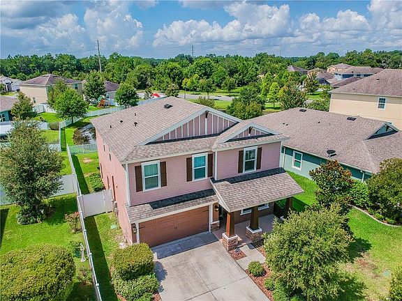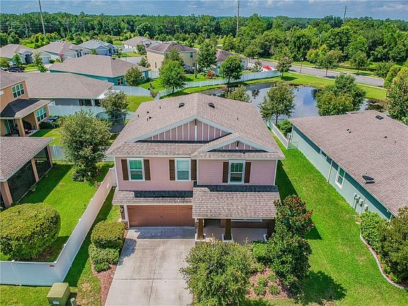 Welcome to this warm and inviting home featuring 4 beds, 2.5 baths on a pond in the lovely community of Oak Creek in Wesley Chapel! Fantastic curb appeal with upgraded stone columns and lush landscaping. The front porch is welcoming and is a perfect place to relax with your morning coffee. Upon entering this remarkable home you will find a large foyer with double door entry to the office/den. Continue on to a bright naturally lit kitchen and living room combination. The first floor is open with wood looking ceramic tile throughout and featuring a large kitchen island that offers plenty of quartz counter-top space for preparing and serving gourmet meals. Add the 42" cabinets, stylish back-splash, upgraded stainless steel appliances and pantry to make it easy for entertaining. The dining room has an upgraded light fixture ready for a large table. The great room is just off the kitchen and has large windows with views to the large fenced backyard. Hidden upstairs is a versatile loft. The roomy second-floor master suite is the perfect retreat to relax after a long day with double sink vanity, walk-in shower, and a large walk-in closet. You will find three more spacious bedrooms with plenty of room for study, sleep, and storage. There is a 2nd bathroom and laundry room also conveniently located on the second floor. To the rear of home is a covered and screened-in patio located just off the great room. Exits to a large fenced in backyard, great for cookouts and running around with a view of pond.