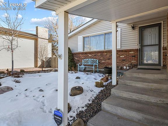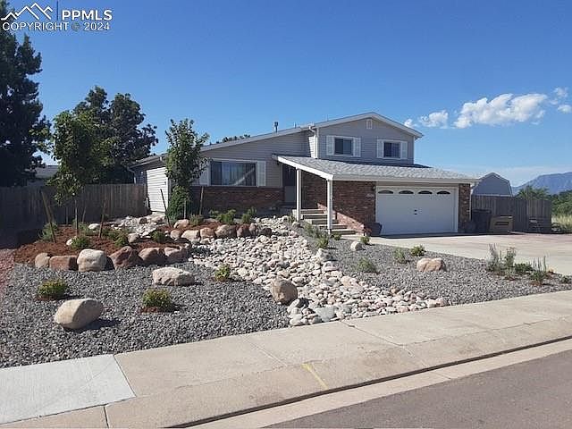 This meticulously maintained home is in ship-shape condition and move in ready! All of the work has been done- Recently remodeled interior, new carpet, fresh custom paint, new roof, shutters, gutters, and low-maintenance landscaping. The kitchen has beautiful clean line stone countertops, print resistant black stainless steel appliances, double oven (second oven is also a microwave), and updated lighting. The primary bedroom has an en-suite bath and walk-in closet. There are 2 additional bedrooms on the upper level and a full bath, all updated. The lower level family room has a classic fireplace wall and walks out to an attached screened in sunroom. Two additional multipurpose rooms on the lower level and a sitting area round out the space and provide a feeling of privacy from the upper levels. Both the front and rear yards are professionally landscaped with a low maintenance/low water design and an automatic sprinkler system. Enjoy a huge patio entertaining area with an outdoor fireplace- all next to a panoramic view of Pikes Peak. The house is situated on a corner lot with open field to the west, and the house sits back from the street with a privacy island in front that allows for simple off- street guest parking. There's a stamped concrete pad adjacent to the driveway that is perfect for RV parking, and one of the sheds is wired (permitted) for workshop use! Bonus amenities include Central Air and a PolyAspartic Flake finish on the garage floor for an easy, clean look. Cherokee Golf Course is across the street within walking distance. This location is perfect for convenient access to military installations, shopping, restaurants, Powers Corridor, and Central Colorado Springs or Falcon. Call today for your private tour!