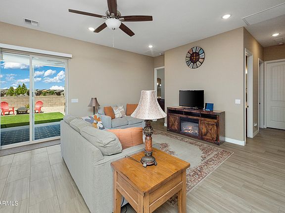 This move-in ready home, located in the desirable subdivision of Granville, offers a range of attractive features and amenities. The house follows the popular 602 floor plan from Universal Homes, providing a great room concept layout with an open living room, dining room, and kitchen. The interior of the home is adorned with several upgrades, including raised height baseboards, tile flooring throughout the common areas, two-tone paint, high-quality window coverings, and multiple ceiling fans. The kitchen is equipped with granite countertops, a large pantry, pendant lighting, and a stainless basin sink with an upgraded faucet. The primary suite is spacious and includes a well-designed bathroom with dual vanities, private water closet, large walk-in closet, and walk-in shower. To maintain privacy, the two guest rooms and guest bathroom are situated separately from the primary suite. Both the front and back yards feature gorgeous low-maintenance landscaping that perfectly complements the immaculate interior. The backyard is fully fenced and offers a covered patio with a ceiling fan and privacy screen, oversized paver patio, and low-maintenance artificial lawn. From the backyard, you can enjoy the park-like atmosphere while taking in the views of Glassford Hill and Granite Mountain in the distance. Additional notable features of this home include 10' ceilings throughout, a high-end security screen door, and an owned soft water system. Furthermore, residing in the Granville community grants you access to numerous outdoor parks, four pools, multiple fitness centers, dog park, several clubhouses, and covered RV parking. Considering all these appealing features and amenities, this home is not likely to remain on the market for long.