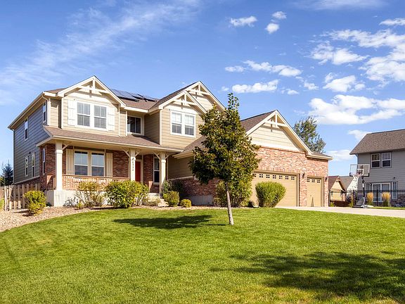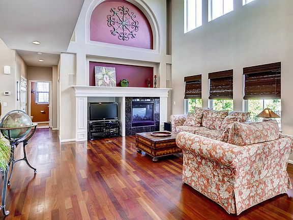This spacious floor plan with high ceilings and large windows offers great open living and natural light. Cherry hardwoods greet you upon entry and lead you throughout. The large open kitchen leads right out back for extended Colorado living with a built in gas fire-pit, indoor/outdoor sound system and 2 level patio. Kitchen upgrades include extended cherry cabinets with pull out shelving, a built in wine fridge, double ovens, over-sized pantry, and under cabinet lighting. Maturely landscaped with several trees/shrubs for privacy. Main floor den/5th bedroom has full closet and fireplace. Solar on roof is a power purchase agreement saving you money on your energy bill. Beacon Point offers free walk/bike in access to 8 miles of beautiful trail around Aurora Reservoir along with a swim beach and lake activities all summer long and also has the lowest HOA fees in this area which give owners access to the great clubhouse with private gym, room rental and resident activities year round.