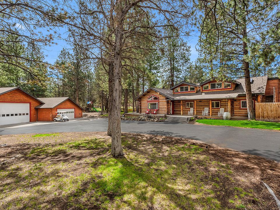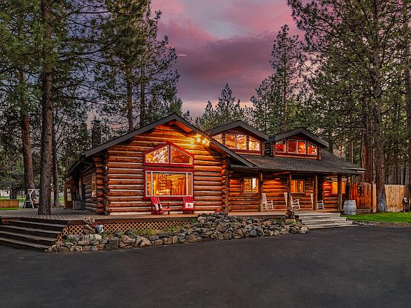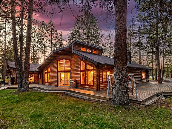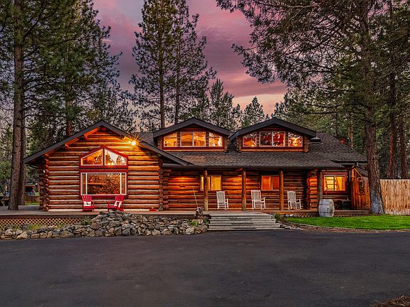 One of the most unique and enchanting properties in all of Central Oregon. At nearly 4300 sq ft, featuring four bedrooms and four bathrooms plus a flex room, living room, dining room and an incredible bonus room with a custom ''NW Tiki bar.'' Perfect for entertaining any number of guests, both inside & out. The home is nestled at the center of a nearly 2 1/2 acre, flat, wooded lot in the popular Saddleback neighborhood just west of the city limits. Minutes from beautiful Shevlin Park and Phils Trail. Also near schools, shopping and restaurants. This home is a dream. Amenities include an expansive wraparound deck, shop/garage space totaling nearly 1800 ft.² that can easily accommodate one or more sprinter vans or RV. Numerous other outbuildings, 220 V hot tub hook up, zip line, fire pit, fireplace, wood stove and RV parking. A rare opportunity to own a home that has only been up for sale one other time in the last four decades! Affectionately dubbed the log Mahal by the current owners!