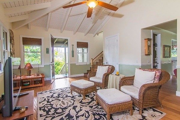 Immaculate Plantation style home is close to everything yet offers privacy on a 30,013 sqft landscaped lot. This home embodies the elegance of a bygone era through the use of retro fixtures, lights and hardware but has all of today's modern conveniences. Upon entry, the open floor plan flows from the living to dining room, which is separated from the kitchen by a breakfast bar. A bonus room, suitable for an office / den, is located off the living room. The gourmet kitchen features marble counter tops, stainless steel appliances, a Shaw cast iron sink, Wolf gas range, Bosch dishwasher and more cabinets than you'll ever need. A full bathroom completes the downstairs picture. Throughout the home you'll find vaulted ceilings with ceiling fans, 8' doors, distressed bamboo flooring, wainscoting, and light filled rooms thanks to the many windows. Carpet keeps it soft underfoot in the bonus room. Solid bamboo flooring is on the steps and landing as you go upstairs, where all three bedrooms have vaulted ceilings, ceiling fans and carpet. You'll love the master bedroom and bath where you'll find a large shower, separate tub and dual sinks. Marble counter tops are in both the master with granite counter tops in the upstairs laundry room. A very private back lanai off the dining area is perfect for relaxing or entertaining. The landscaping throughout the property is extensive and features many fruit trees such as orange, key lime, avocado, mango - to name a few. Beyond the grassy backyard is a small bridge which crosses an occasional runoff creek and provides access to the back portion of the property. The home was designed for easy Island living and has been meticulously maintained and lightly used. The entire home was painted outside in 2013 and inside in 2014. This home is move in ready, suitable for your most discriminating client.