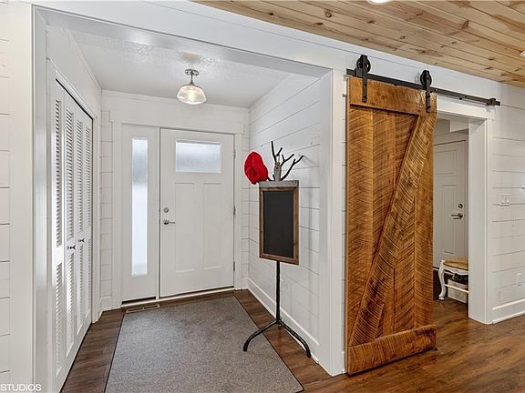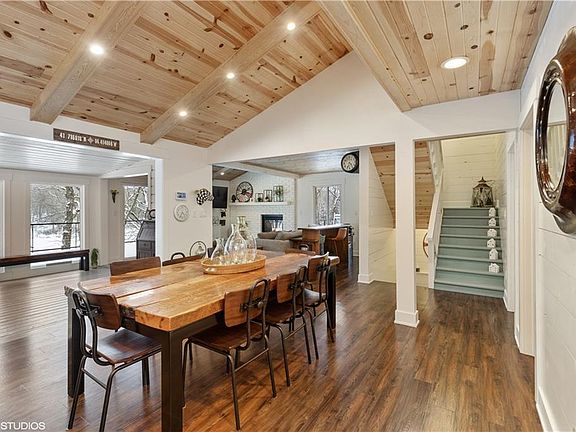 Almost everything is NEW. Shiplap walls, wood ceilings. LVT floors, windows that are new are Marvin. New kitchen! Butcher block island! Entertaining is a breeze with the wet bar. 5 bedrooms, two with multiple beds and bunks. Spectacular view. New addition with Master, Master Bath (Wet room) and Guests bedroom. It's a dream lake home! Glass around the entire lake view. Walk or Drive to the water with a new beach, concrete path and landscaping. This property has an asphalt drive to the lake. Load everything on your vehicle and drive to lake. Enjoy jumping on the boats from two lifts! Ask agent for the list of renovations that were completed in 2017. Oh wait, there's more. This property also offer a detached garage with storage for two vehicles and a 13' X 37' space for boat, pontoon etc. storage. Over 1009' sq ft. And..1.31 Acres!! 210' of water frontage. And a covered boat house! You can't find that any where else! Heated garage!! Drive to water, no need to carry water gear!