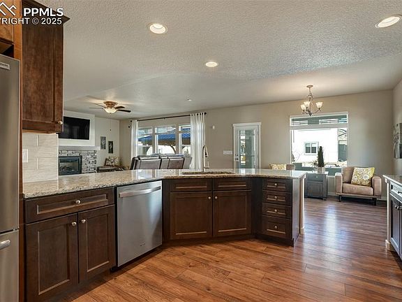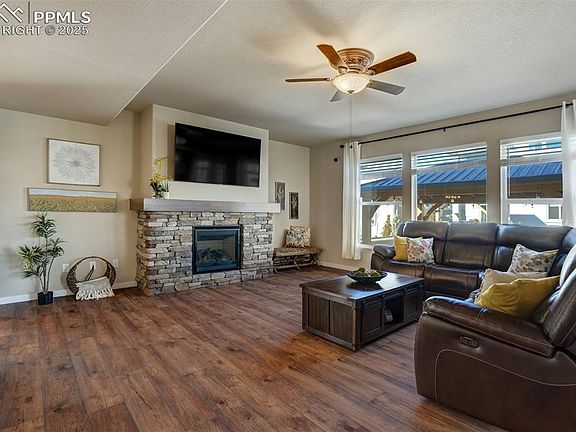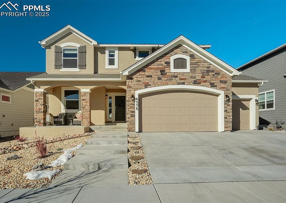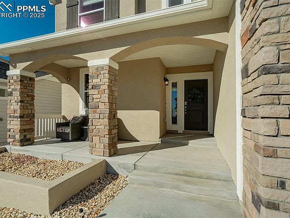 Pristine newly built home in gorgeous Wolf Ranch. Why waste months waiting for a new build when all of these extras await you! Built in 2022, this highly sought after Monarch floorplan by Classic Homes is truly move in ready with full xeriscape landscaping, fencing and breathtaking mountain views centered on Pikes Peak. Step inside this stylish abode where every detail has been meticulously crafted to create a sanctuary of elegance and comfort. The thoughtful, seamless flow of the floor plan, showcases a stunning gourmet kitchen that is a chef's delight including a large granite island, upgraded appliances and an abundance of storage. Who does not want a generous mudroom such as this one has? The welcoming Great Room is bathed in natural sunlight, and a refined main level office for those seeking a tranquil workspace. As you make your way upstairs, your luxurious primary retreat awaits boasting more views of Pikes Peak, ample walk-in closet, and spa like bath with soaking tub. Three additional bedrooms, a full bath, spacious laundry room with sink, and a versatile loft provide desirable space for relaxation and recreation. Descend to the fully finished basement, where an ex-large sized family room with beautiful corner fireplace (one of two in the household) beckons for gatherings and celebrations(pre-plumbed for a wet bar). Discover another inviting bedroom and full bath offering a private haven for guests to enjoy. The backyard oasis where the custom gas fire pit, additional concrete patios, hot tub hook up and grand pergola sets the scene for enchanting evenings under the starlit Colorado sky. For the car enthusiast, the 3 car garage has a service door allowing easy access to your backyard and has been extended an additional three feet for outdoor equipment. This home truly exemplifies the pinnacle of modern amenities and finishes. Your new beginning is HERE in this exquisite house!