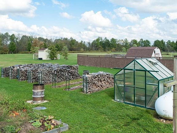 This open ranch-style split bedroom floor plan is situated on nearly 2 acres and offers cathedral ceilings/plant ledges in the great room, a dinette area, and a fully equipped kitchen! Special features include a 2-car attached garage and 2-car detached garage and a wood burning stove in the basement to help minimize Winter heating bills. The FULL sized basement is roughed in for a bath and is ideal for finishing! All firewood on the property remains and the small ''greenhouse'' stays as well! HomeGard Home Warranty in place!