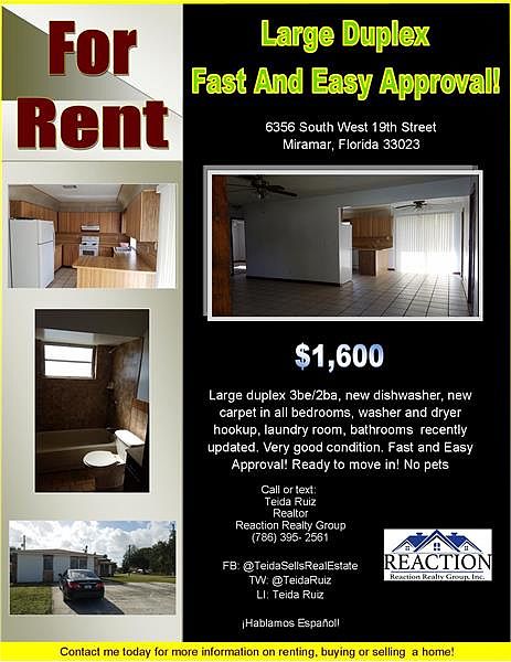 Large duplex, 3 bedrooms 2 bathroom, new dishwasher, new carpet in all bedrooms, washer and dryer hookup, laundry room, bathrooms recently updated. Very good condition. No pets. First month and security deposit only to move in! Address: 6356 South West 20th Street, Miramar, Florida 33023 Call or text: Teida Ruz Reaction Realty Group (786) 395-2561 For more information about properties you can visit: FB: TW: https twitter.com/TeidaRuiz Hablamos Espaol!