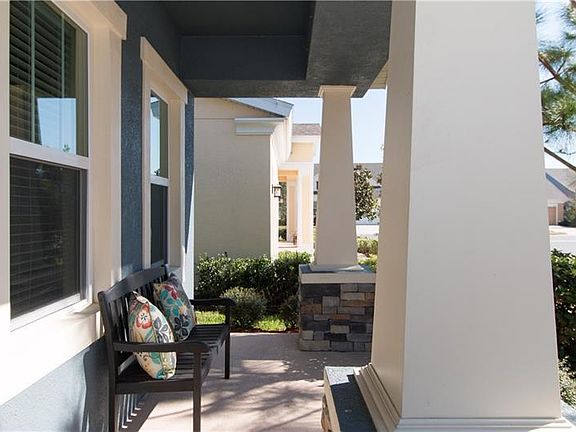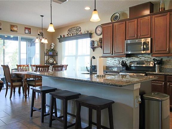Immaculate 4 bedroom, 2 bath, 2 car garage home that was built by award winning Homes by WestBay. Covered screened-in entrance that opens to an abundance of natural light from a spacious floor plan. This entrance is also located next to a relaxing covered porch. Security cameras in front to monitor approaching visitors. As you walk in you will be treated to a well equipped kitchen with granite counter tops, center island with sturdy overhang, solid wood cabinets, stainless steel appliances, pantry, and newly installed glass backsplash. The kitchen is positioned next to a great living room and when combined with the dining room make it all ideal for entertaining. There are sliding glass doors off the dining room that open to the covered and screened lanai (ceiling fan included) with new pavers that provide another relaxing place to enjoy the fresh Florida air. The master suite contains a master bath with double sink vanity, oversize walk in shower (with built in seat) plus a spacious walk in closet. Back yard is fenced and there are no immediate backyard neighbors. Community amenities include swimming pool, playground, basketball and dog park. Subdivision is located close to shopping malls, restaurants, hospitals and schools. Ask about 100% financing. Home comes with an American Home Shield® Home Warranty. Don't wait. Schedule your showing today!