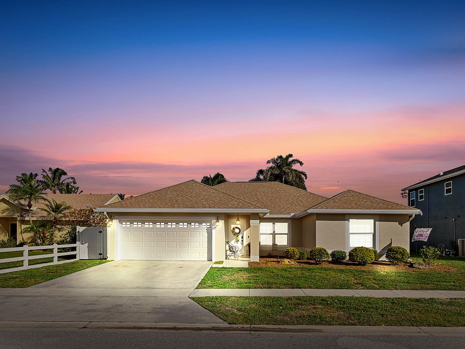 Welcome to this meticulously maintained 4-bedroom, 2-bath waterfront haven with a private pool, nestled in a serene setting with a fenced rear yard and breathtaking lake views. Step inside this true 4-bedroom gem, where an immaculate open floor plan unfolds seamlessly, offering a family room, living room, and formal dining area. The kitchen, adorned with modern appliances and quartz countertops boasts generous counter space, and a spacious pantry, ensuring culinary delights in a stylish setting. This beautiful home also features luxury vinyl flooring throughout, vaulted ceilings with a wood beam, custom trim around doors, and a full size washer and dryer. The masterfully designed home features a tub in the guest bath and a shower with frameless doors in the master bath, enhancing the luxurious appeal. The water view captivates from the salt water pool and expansive covered lanai with 72 inch fans, providing an idyllic spot to unwind. Impact doors and windows throughout and master suite open to the pool/patio, creating a seamless indoor-outdoor living experience.