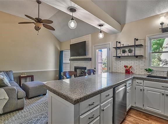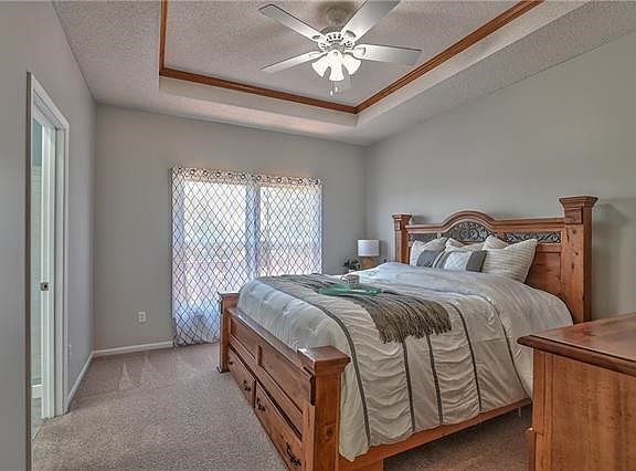 WOW-THIS IS THE ONE!Great curb appeal with a SWEET front porch (there's a built-in bench!) and a beautiful front door, this home invites all visitors to come inside! New feature stair carpet leads you up to the wide open formal dining area, large enough to house a harvest table and a buffet! The spacious family room, with gleaming hardwood floors, is open to the kitchen-great for entertaining! The remodeled kitchen is a cook's dream with lots of granite counter space, a pantry and a new range! The master suite is large enough to house lots of furniture and has a private entrance onto the deck-romantic glass of wine, anyone'? The ensuite bath can accomodate lots of activity with a double vanity, jetted tub and a shower! The 2 guest bedrooms and hall bath finish out the main level. Downstairs is the spacious Rec Room, with windows at both ends! Need a 4th bedroom? This could be it, with a closet located in the hallway! A nicely appointed full bath with the laundry tucked inside, are also on the lower level. The oversized garage walks out to the patio, but wait, there's a bonus! Located behind the garage is flex room that could be an office, playroom, workshop, gaming room or storage-separated from the rest of the house, it would be perfect for noisey activities! The treed backyard is beautiful and has a terrific treehouse any child would love! Totally fenced and backing to greenspace that is the MILLCREEK STREAMWAY PARK-17 miles of walking or biking is right outside your gate! New roof, new interior paint, new carpet and a newer HVAC-all the big ticket items are done! Great access to recreation, dining and shopping plus award-winning DeSoto schools....-nestled in the beautiful, rolling hills of Western Shawnee.......BOOM-IT'S PERFECT!