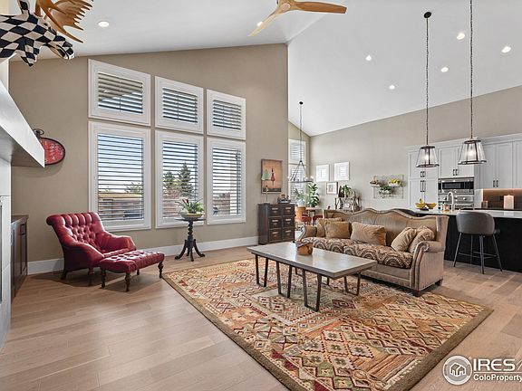 Welcome to luxury living at Harmony Villas, part of the prestigious Harmony Golf Club. Situated on the largest lot in the Villas, enjoy the Colorado lifestyle with stunning Rocky Mountain views. Originally the Villa's model home built by Springhaus Design & Construction, this contemporary floor plan features high vaulted ceilings, a gorgeous great room with a stone fireplace wall and custom built-ins. Quartz countertops in the gourmet kitchen with a generous sized island and sunny dining area connecting to a covered patio. The large primary retreat offers a deluxe bath, walk-in closet and attached laundry room. The lower level retreat has a spacious rec room, gaming area, 3rd bed, full bath, and a flex room or 4th bed (no egress or closet). Resort living at its best including a challenging golf course, gym, tennis and pickleball courts, and salt water pool. Don't forget the new Blingle exterior lighting for making special occasions light up and an upgraded Halo water filtration system. Enjoy your best life at the Villas!