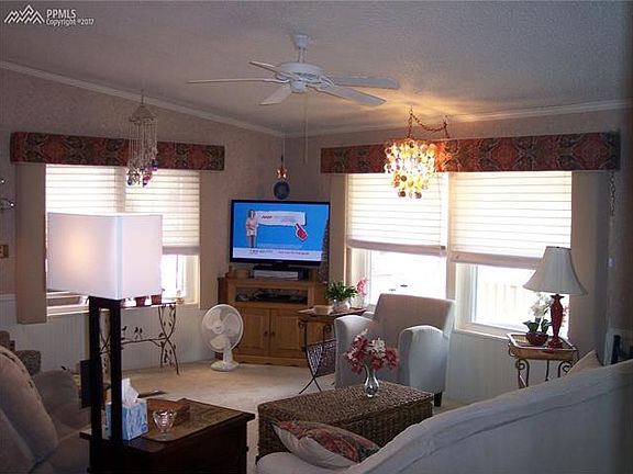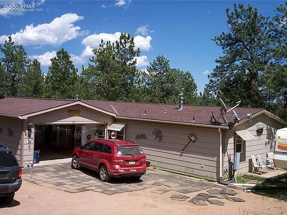 Very nice 3 br, 2 ba, 2 car over-sized garage on beautiful 4+ acres of Pine and Aspen trees. New kitchen remodel, new appliances, new windows, new large very nice wraparound redwood deck for entertainment. View of Pikes Peak, RV Hookups. Is on permanent cement engineered foundation, purged. An easy 30 minute commute to town, 50 minutes to C.S. A real Paradise on over 4+ acres w/trees and views !! This looks and feels more like a well made MFG home than a purged double-wide. Great condition and quality !!
