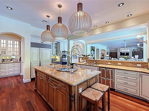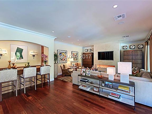 Canyon Fairways finest! Premier luxury home on premium lot overlooking the Greenbelt in guard gated Canyon Fairways at Summerlin Las Vegas. Quality and attention to detail throughout. Elegant Brazilian cherry wood & limestone floors, Formal living room with hand carved fireplace and Venetian plaster ceiling. Oversized formal dining room with buffet perfect for any gathering. Gourmet kitchen with island, bench seating and breakfast bar. Wide open and enlarged family room with modern lineal fireplace, wet bar and wine room. Guest room with walkin closet and full bath downstairs. Master suite with sitting area, fireplace, crown molding, his/her bathroom with 2 walkin closets and a huge covered balcony. Two additional ensuite bedrooms upstairs with a sitting area/den in between. Upstairs exterior covered entertainment balcony that overlooks the peaceful greenbelt. Downstairs covered patio complete with arches, columns and light fixtures. Outdoor kitchen with built in BBQ. Relaxing 2 lane lap pool, spa and water features. Numerous doors and windows let the outdoors in. Lush private luxurious landscaping complete the ideal environment. You won't believe you're in Las Vegas! Canyon Fairways luxury home living at its finest.
