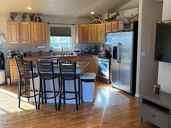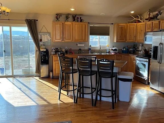 This attractive, move in ready home sits on a little over an acres of land (1.01 acres) with plenty of room. Kitchen is an open concept with an island, beautiful cabinets and finished hardwood floors. Master Bedroom is split apart from other rooms upstairs for privacy. In the finished basement enjoy a cozy gas fireplace and lots of room to spread out. Laundry hook-ups on main level in pantry, if you would like to convert the pantry to a main level laundry. Fenced in back yard with lots of room to entertain or enjoy quite times with a wonderful view of the mountains. Feel Free to expand beyond backyard fence as property goes WELL BEYOND FENCE. Located north of Highway 50, within minutes of shopping centers, golf course, fire station and emergency services.