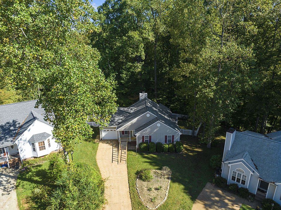 Across the street from Joyner Park and with incredible privacy, this charming Wake Forest home is everything you're looking for! The large deck overlooks the white fenced backyard, wooded buffer and a babbling creek. The 1-car garage offers storage. Cul-de-sac lot offers privacy. New flooring. Long driveway. Ramp on the front can be removed and railing reattached. Heat pump 2022. Refrigerator and washer/dryer. Roof 2011. Water heater replaced 2018.