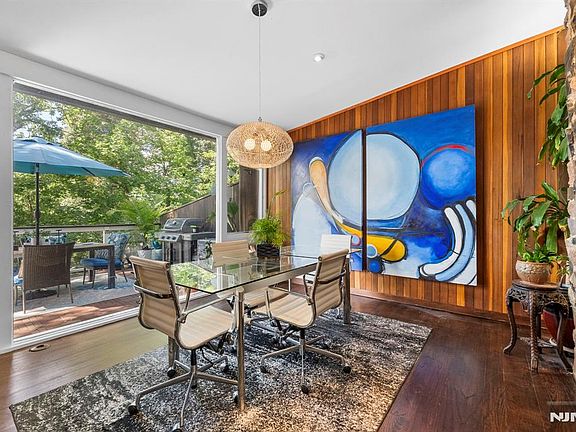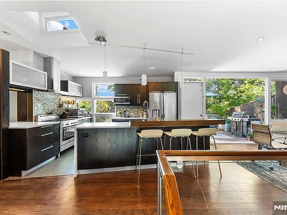 Nestled on the border of Englewood/Fort Lee sits this mid century modern architectural masterpiece. You are immediately greeted by the manicured landscaping, pond, stone walkways and abundant trees. As you walk in to the first level you will find the renovated kitchen with quartz countertops & center island, stainless steel appliances and sleek soft close cabinets. The open concept flow leads to a spacious dining area, with access to the outside terrace with a grill, sitting area and perfect for relaxation. The ground floor family is the perfect entertainers paradise with abundant space, oversized windows, and a stone wood burning fireplace. Upstairs you will find the 2 spacious bedrooms with the primary having a large oversized window perfect for the natural light lovers. The modern bathroom features a large walk down stand up tiled shower. The basement is fully finished and provides great flex space or as a in law suite with a full bathroom. The fully fenced in backyard provides great gardening area, a jacuzzi that can be used year round and enough recreating room to entertain. The home has been carefully renovated and crafted over the years adding updates such as radiant hydronic heating, a brand new paved driveway, tankless water heater, custom modern closets throughout and much more. Homes like this don't come around too often and this one will be sure to impress!