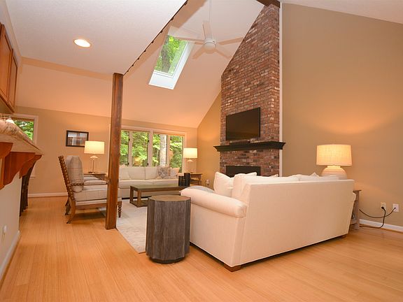 Standalone Parkhurst style condominium in Eastman with 4 bedrooms and 3.5 baths! Privately situated in West Cove for easy access to Eastman Lake, beach and walking trails. A floor-to-ceiling brick hearth is the focal point of the great room with cathedral ceiling and skylights for an open and bright atmosphere. The kitchen features beautiful granite countertops, stainless steel appliances and ample cabinets. Open dining area with sliders to the wraparound deck. Primary bedroom with bath conveniently situated on the main level with deck access. Large lower level family room/rec room offers even more living space. The upper level has a loft area overlooking the great room, 2 more bedrooms and another full bath. The half bath is on the main level and the 4th bedroom and 3rd bath are on the lower level. The Eastman Community offers lake activities, golf, tennis, pickleball, cross-country ski trails, an indoor pool and fitness center, and so much more. All this in the heart of the Dartmouth - Lake Sunapee Region.