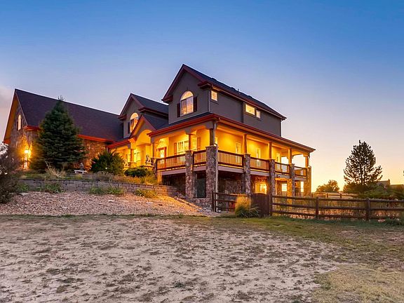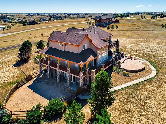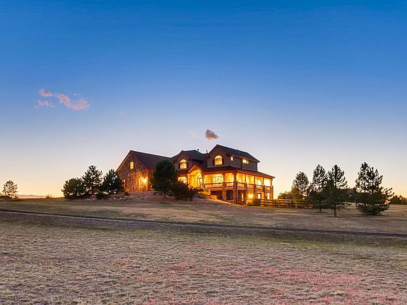 Are you looking for an open, bright home on acreage and still close to town? Welcome home to this custom built 2-story with full wrap around porch on 5 acres in beautiful Sky Rim neighborhood. Privacy, views, paved roads and only minutes from Parker, Southlands and E470. You'll love cooking in the gourmet kitchen with pantry, double ovens, island with seating and access to the wrap around deck with gas line plumbed for the grill. Main floor office and bedroom with 3/4 bath are perfect for a guest suite. Entertainers dream with open floor plan, butlers pantry next to dining room and choice of indoor or outdoor seating areas! Huge master suite with fireplace, private balcony, 5-piece bath with a dreamy walk-in closet. Both bedrooms upstairs have their own attached full baths! 3-car garage. You'll love the maintenance free exterior and the landscaping designed for low-water usage with xeriscaping and mature pine trees. Home warranty included!