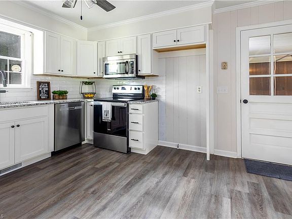 Rare find in Wallburg! Move-in ready, updated brick ranch with 2 car garage sitting on over an acre. Enjoy the privacy of the wooded back yard from the deck or patio. Beautiful new kitchen with shaker cabinets and granite counter tops. New flooring throughout with LVP in the living area and new carpet in the bedrooms and bonus room. Large flex-space bonus room in the basement. The utility garage in the basement also offers extra storage or potential for a shop or home gym. Roof was replaced this year.