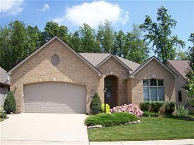 Elegant and Stylish describe this 3 bed, 3 bath, full brick front ranch home. Hugh Great Room with marble faced gas log fireplace, custom built bookcase/hutch and 12ft high ceiling. Marble flooring in foyer. Custom built kitchen with walk in pantry, all applicances stay, bay/bow window overlooks large deck. Deck is partially covered, sit and relax and enjoy the views. Master bedroom has built in jewelry case and window seats, luxury master bath with jetted tub to relax in on those hectic days. One bedroom has French doors and was being used as a sitting room/office. There is an area for a closet. 1st floor laundry room with cabinets and built in laundry tub. Washer and dryer will stay. Hugh basement with a full bath. Many ways you can finish off. 90% efficient furnace with back up heat pump for maxium efficiency. All this on a professionally landscaped homesite with a sprinkler system and great views front and back of the golf course. Don't miss out on this one.