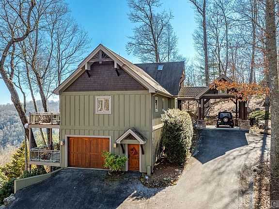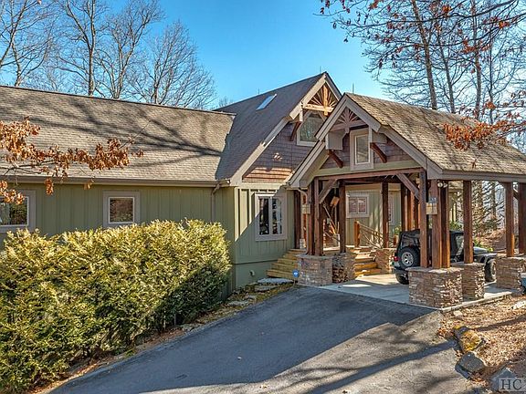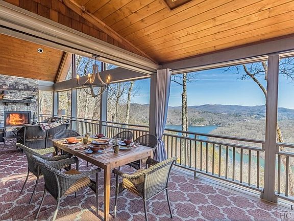 Just over the rainbow, this custom built home has ever changing awe-inspiring views from one end of Lake Glenville to the other! Expansive panoramic 180 degree views from the oversized covered porch w/stone wood burning w/gas starter fireplace, dining area, hot tub & motorized remote controlled clear blinds for year round use. Every bedroom, living room, kitchen, & game/theatre room has an unobstructed view of the lake. Absolutely exquisite heart pine floors, mantle & ceiling beams are from an old cotton warehouse. Living room has a beamed cathedral ceiling & a stunning stone gas fireplace flanked by built-ins. 3 bedrooms on the main level (split plan), open living/dining/kitchen plan. Lower level has partial kitchen, another bedroom & a ‘bonus' bunk room. Ample storage, elongated garage for a boat & 2 workshop areas, lightning protection & security alarm systems, & a porte cochere for covered entry. Selling mostly furnished- including hot tub, pool & ping-pong tables. This small gated friendly neighborhood has paved roads & its own community center for potluck dinners, a playground & a basketball court. Original owners -first time on the market & priced to sell! Lake Glenville is a popular tourist destination and is the highest elevation lake east of the Mississippi River, with 26 miles of shoreline covering over 1,400 acres surrounded by beautiful mountain peaks. Enjoy water skiing, tubing, fishing, paddling, and more on this picturesque mountain lake. This home location is equidistant between the charming towns of Cashiers, Highlands, Franklin & Sylva. Very well priced & awaiting new homeowner to enjoy spectacular vistas & making forever memories!