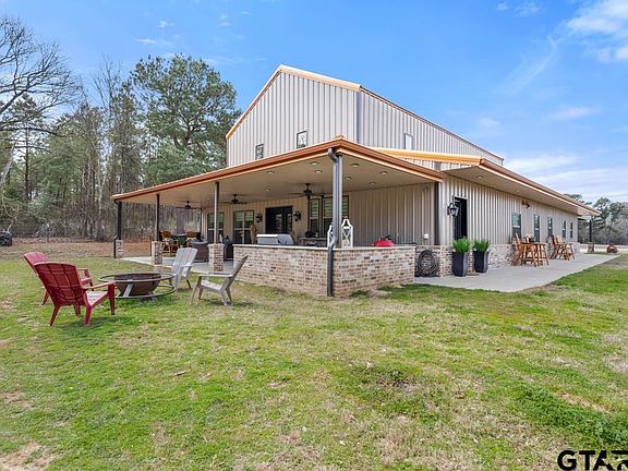 Tranquil Country Living Looking for peace, wildlife by your pond, and the perfect spot for morning coffee? Welcome to 636 Spruce Rd, a stunning Barn dominium combining rural charm with modern luxury. A huge porch offers lovely views of the pond, tree line, and 10-acre Ag-exempt hay field. The remaining 6.89 acres include a fruit-producing orchard, pecan trees, a potable well, and an old barn—perfect for an FFA/4H project or potting shed. There's plenty of space for a horse barn and arena, and the secure double fencing keeps horses, cattle, and pets safe while keeping wild hogs out of your garden. Inside, the open-concept great room features high ceilings and a fireplace, with an adjoining dining area large enough for multi-family gatherings. The chef’s kitchen boasts: Oversized Island with prep sink & seating; Viking gas stove, pot filler & double oven; Farmhouse sink, dishwasher & two pantries. The primary suite includes Walk-in closet with makeup vanity; Spa-like bath with soaking tub, shower & double vanity. Also on the first floor: Guest room & hobby room; Full bath & laundry room with pet bath. Upstairs offers a fun entertainment area, mini-kitchen, two bedrooms, and a full bath with a laundry chute. One bedroom has barn doors and overlooks the great room. Additional amenities: Concrete driveway and oversized parking pad; 5-car carport & supersized 2-car garage; Workshop, office, half-bath & electric lift to attic storage; Generac backup generator. This meticulously designed home offers a nearly unprecedented amount of storage space, palpable serenity, and charm. Don’t miss your chance to own this dream retreat!