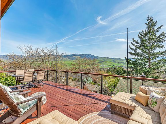 Updated view home above the boulevard near Asante Ashland Community Hospital, just four minutes from the plaza and Lithia Park! Tiled entry and formal dining with two wine refrigerators and built-in buffet, gourmet kitchen with radiant heated floor, stainless appliances including two Wolf ovens, six-burner cooktop with griddle, two dishwashers, and pantry with second refrigerator. Vaulted great room with exposed beams, river rock fireplace with wood mantle, and sliding glass door to refinished redwood deck with panoramic mountains and valley views. Three main-level bedrooms and two full bathrooms including primary with walk-in closet and full ensuite bath with radiant-heated floor, double vanity, and tiled shower. Lower level with new carpet in fourth bedroom or office and spacious family media room, half-bath, gym with washer dryer hookups, plus a 300+ SqFt bonus room with two skylights suitable for workshop or potential guest quarters with exterior entrance. Inquire for details!