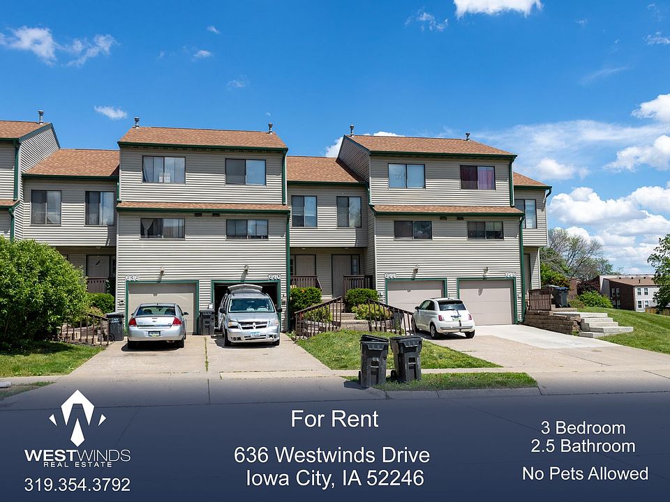 This 3 Bedroom 2.5 Bathroom Town Home is available for August 1st, 2025 Move In! NOTE: The Living Room Flooring in 636 Westwinds Drive is Carpet and NOT LVP. Copy this link to your browser to schedule a showing at your convenience. 3 Bedrooms, 2.5 bathroom town home located in Iowa City. This multi-floor town home is located on the west side of Iowa City and features a spacious living room with large, walk-out deck. The kitchen features dishwasher, breakfast bar and plenty of cabinetry and pantry space. 2 Bedrooms and a full bathroom are located in the upper level. The lower level features bedroom with private en-suite. In-Unit Washer and Dryer. Conveniently located near HWY 218/i380 with nearby schools, UI Hospitals & Sports, grocery, restaurants and nearby bus stops! Included in Rent * Lawn Care * Snow Removal * 1 Car Garage (Attached) Not Included - Tenant Responsibilities - Electricity & Gas: MidAmerican - Water: City of Iowa City - Garbage Additional Disclaimers *Photos/Floor Plans May be of a similar unit *No Pets Allowed Please visit our website for additional rental properties, for application details, schedule showings, and much more!