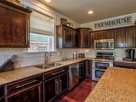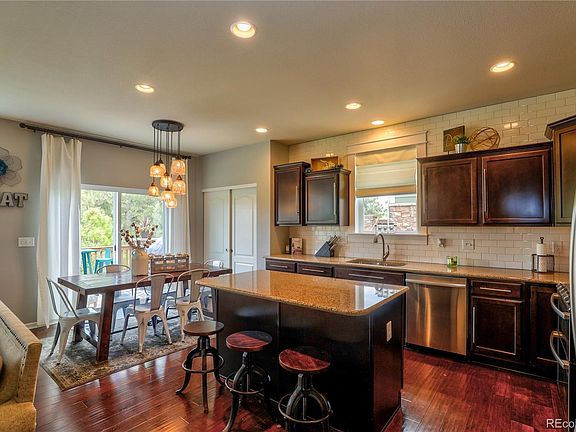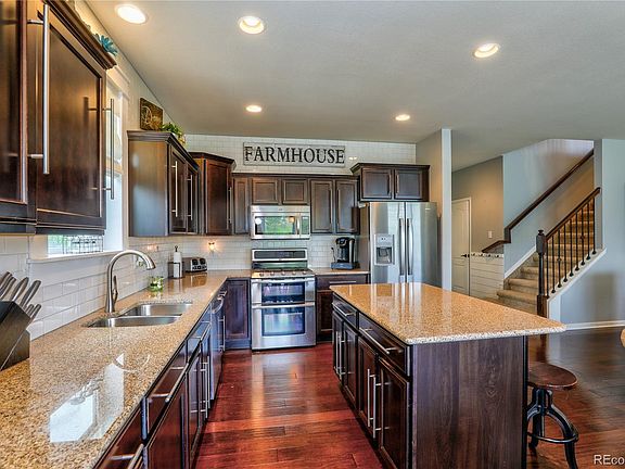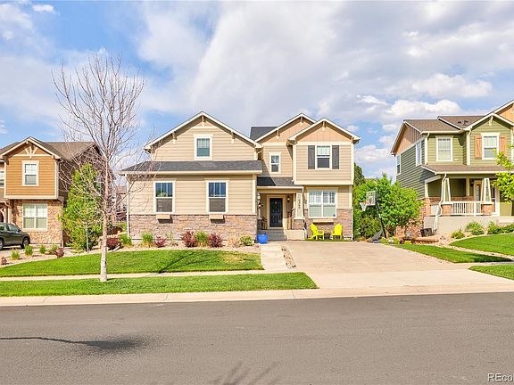 Beautiful home on an incredible lot backing to open space in the quiet Wheatlands neighborhood. Natural light floods the open floor plan with fabulous finishes throughout. The main floor features a spacious office, custom barn door that leads to the private guest bedroom and bath. The kitchen boasts stunning slab granite counters, kitchen island, pantry, and stainless steel appliances. The dining area looks out to the deck and the open space below. The living room has plantation shutters and a fireplace centerpiece for those cool Colorado evenings. The second floor has a large master bedroom suite with walk-in closet and master bath. Two additional bedrooms, a laundry room, a homework nook, and a large loft complete the 2nd floor. Escape to the walkout basement for all your entertaining with a large wet bar, family room complete with surround system, secret storage room behind the bookcase and quiet reading nook. You will love the lower patio, with a sitting area and quick access to the community trail leading to the clubhouse, pool, and elementary school. Enjoy the protection of a hard wired ADT security system with ring doorbell, new roof installed in February and of course all the amenities the Aurora reservoir and Southlands has to offer. Welcome home!