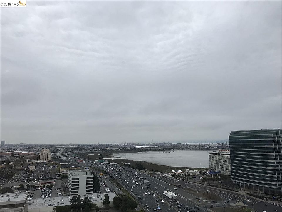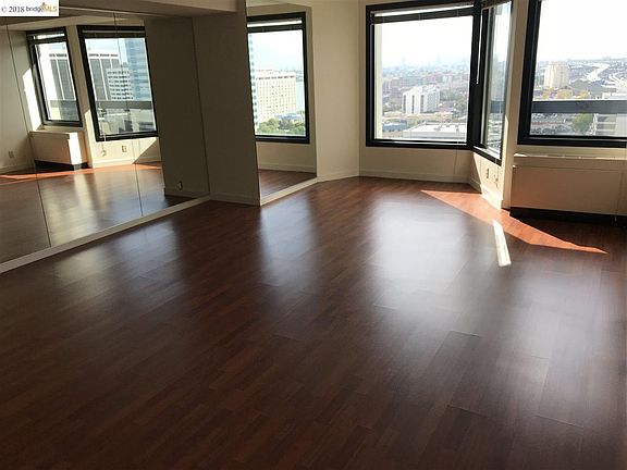 Large one bedroom condo at luxury hi-rise Pacific Park Plaza in Emeryville. Laminate floors in entrance,kitchen and living room.Carpeted bedroom.Vinyl bathroom flooring.Stainless steel appliances including new microwave. Warm and sunny south bay view facing Oakland,Bay Bridge and partial water view from the 15th floor.Great location,many amenities,24 hr. security.