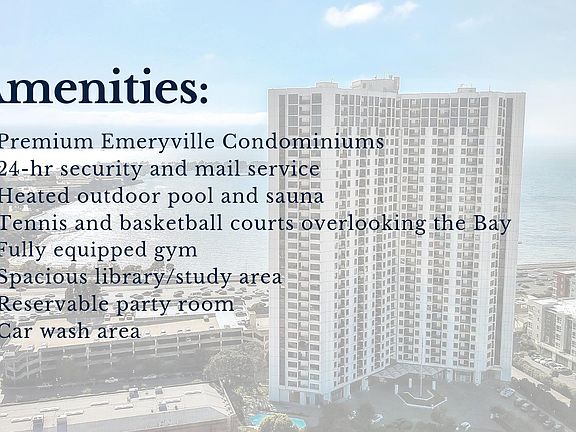 Rent shown includes HOA! Views. Social life. Commuting hub. This is hands down the best Condo location in Emeryville. You'll feel like you're living at a chic resort. There's even a large study area where you can chill, read, and relax. Want social life and good eats? Your thriving community is alive with delicious food and great entertainment -- fine restaurants, cafes, movies, and the recently renovated Public Market -- just steps away. Go slightly further and you're surrounded by even more outdoor tastes and sounds at the ever-bustling Bay Street, a premier shopping destination in the Bay Area. There's no shortage of activity and life here, all within one square mile of your unit, all walkable! Imagine feeling tired after an amazing day, where you simply walk back and sip your coffee as you overlook the Berkeley hills and twinkling Emeryville lights. Enjoy VIEWS from nearly anywhere in your cozy 8th floor unit. If you want to go on an adventure or need to travel for work outside Emeryville, there's no better hub than Pacific Park Plaza. Talk about options. Easy access to the main freeways (SF is minutes away), a shuttle to Bart, the Amtrak train -- all within easy reach! Water, garbage, cable, and HOA services included. Tenant pays for PG&E.