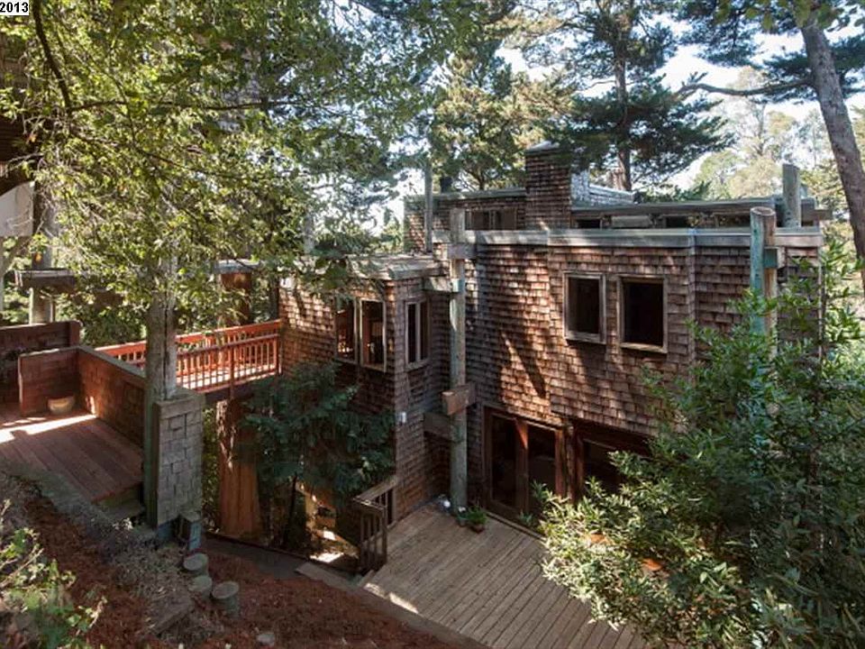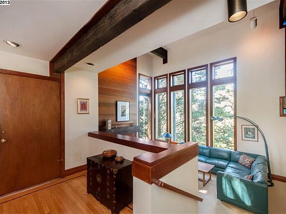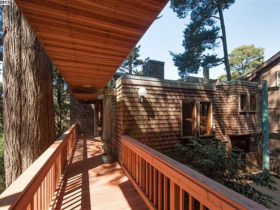 Artfully suspended from an elegant framework of massive poles and beams, this magical tree house integrates extraordinary design into a leafy, pine-studded hillside, its light-filled rooms radiating outward from four central poles like platforms in an enchanted forest. Inside, soaring spaces, custom cabinetry, walls of redwood and walls of glass are framed by the geometry of beams and tall poles; the fifteen exterior poles both anchor the structure into its site and become part of the wooded landscape. Eight living levels, each just four steps apart, hang from the beams, which span from pole to pole. The open plan creates dramatic sight lines inside and out, from the balcony foyer overlooking the living and dining rooms and forested canyon to the small jewel-like windows beneath each beam, a subtle architectural expression of the suspension-based structure; there are no bearing walls. Five broad decks, some interconnected, enhance the indoor/outdoor flow. Built by architect Harry Jacobs, FAIA, for his family in 1971 and cherished by its second owner since 1991, this fine, carefully engineered example of post and beam construction invites lovers of architecture and the natural landscape, here beautifully blended, to this serene Piedmont Pines neighborhood.