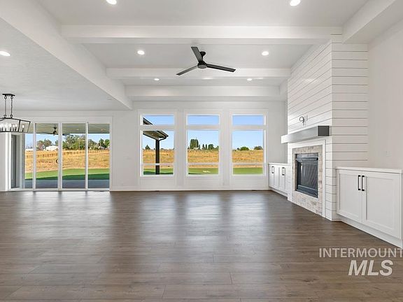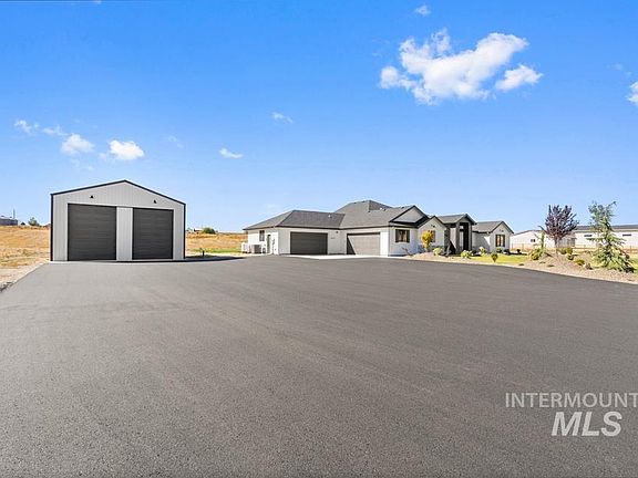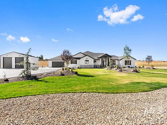 Amazing Modern Farmhouse in small country sub on 5 acres with shop features 4 Bedrooms, 3 baths, 4 car garage. This beautifully upgraded home has 11' tray in Great room, beams, fireplace with built ins. The open layout is perfect for entertaining with lots of windows and extensive millwork. Enjoy cooking in the gourmet kitchen with a large quartz island, farm sink, double stacked cabinets, Bosch double wall oven, 36" cooktop, microwave drawer oven and large pantry. Need a 2nd primary suite or bonus rm, look no further. The master bedroom has X beams with shiplap, large windows & a spa like en suite. Relax in the large soaker tub, 2 separate vanities, and walk in shower & large walk in closet. Enjoy the massive covered back patio for BBQ's. Backyard windows upgraded to Solar. 30x40 shop with electricity. Sub is just north of Middleton in Gem County. Water rights and Irrigation! Too many features to list! GPS 6350 El Paso to find easier. Ready for you now!