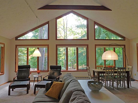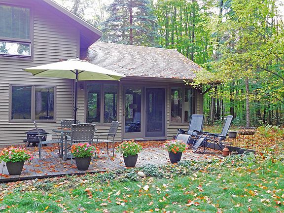 Enjoy the view! Home features a Living room and Family room with large windows overlooking private yard on the end of a Cul de Sac. 3 bedrooms 1 and 1/2 bath beautifully maintained home. Cozy up to the freestanding gas stove in the living room or gas fireplace in the family room on a chilly night. Large open living area with many updates. Cathedral ceiling open concept floor plan. Main floor bedroom and laundry. Wonderful private brick paved patio out back and large trees out front. Enjoy all the perks of Michaywe'. Golf course on site with member discount, Indoor and Outdoor swimming pools, hot tub, tennis courts, Cross Country ski trails, hiking trails and outdoor Volleyball. Area also has the Inn the Woods restaurant open year round and a Pub. Numerous golf courses and skiing