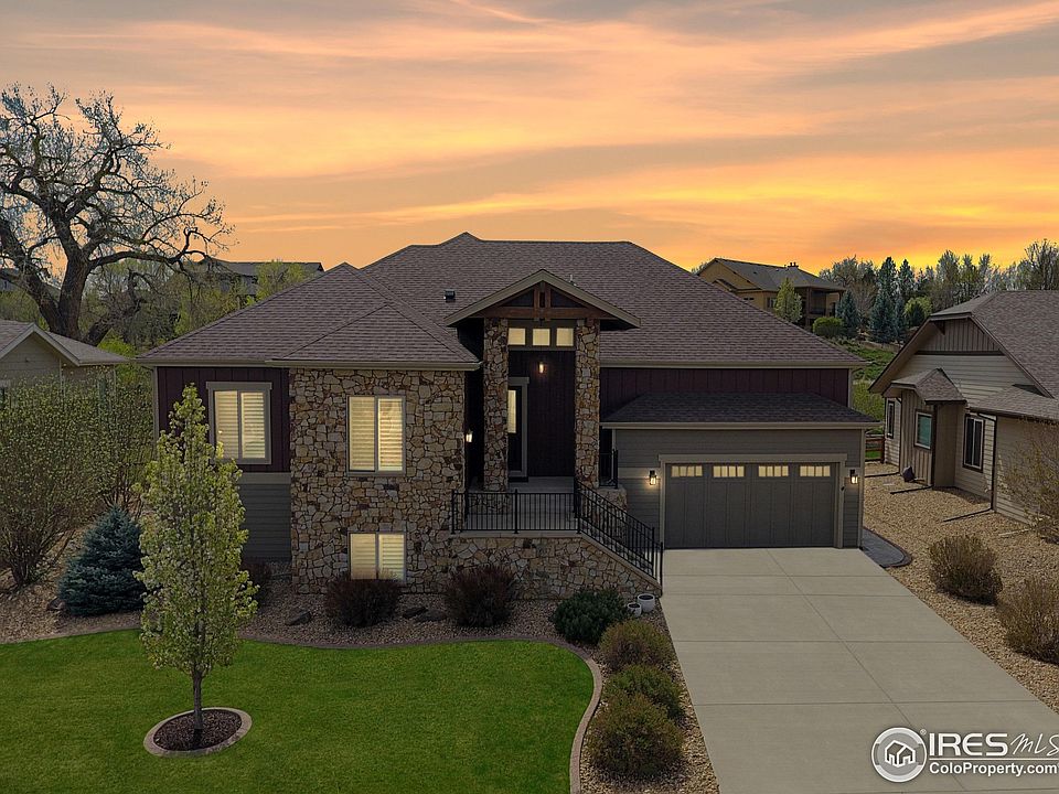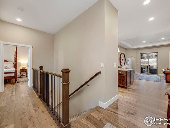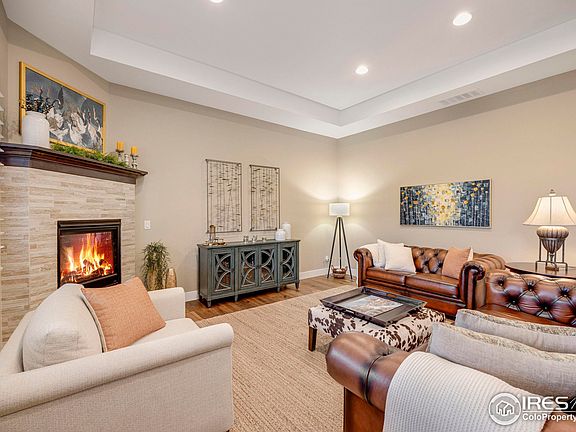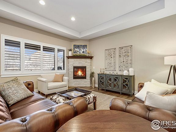 Nestled in one of Loveland's most desirable golf course neighborhoods, 637 Deer Meadow Drive offers an exquisite blend of luxury, comfort, and nature. Backing to a private greenbelt frequented by wildlife, this stunning raised ranch home is perfectly positioned for quiet relaxation while still be close to recreation. Enter inside to find elegant design elements throughout, starting with recently installed hardwood floors that flow seamlessly across the main level. A striking stacked stone fireplace serves as the centerpiece of the spacious living room, while the chef's kitchen impresses with sleek cityscape cabinets, a graceful range hood, quartz countertops, a generous island with seating, and high-end stainless-steel appliances. The private primary suite, tucked at the back of the home, is a true retreat featuring a luxurious five-piece ensuite and a spacious walk-in closet. Two additional bedrooms on the main level provide ample space while maintaining privacy. The garden-level basement with 9' ceilings expands the living space with two more bedrooms, a full bath, and a versatile recreation area-perfect for a game room, home theater, or entertaining space, all illuminated by natural light from the elevated design. Plantation shutters throughout the entire home ensure privacy and efficiency. Outside, the covered back deck invites relaxation in the serene backyard oasis and the front patio provides views of the foothills. Completing this incredible home is a massive four-car garage, ideal for vehicles, gear, and outdoor toys. Located just across from the third hole of the prestigious Mariana Butte Golf Course, this home offers easy access to the clubhouse, driving range, and Birdie's Burgers and Brews. Outdoor enthusiasts will appreciate nearby Mariana Butte and Devils Backbone Trails for hiking, as well as Boedecker Reservoir for paddle sports. Experience the perfect blend of elegance, nature, and recreation-schedule your tour today.