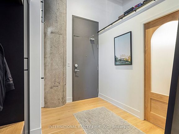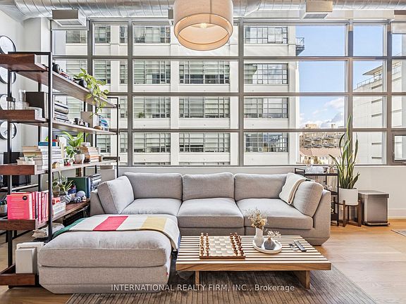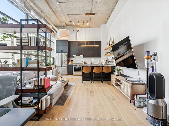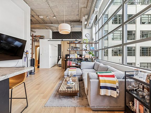 Step into a truly unique home at the iconic Tip Top Lofts. This fully renovated, light-filled suite stands apart with rare large windows that stretch the entire length of the unit - including a windowed bedroom, a feature seldom found in the hard loft portion of the building. With soaring 13 ft 2 in ceilings, the space feels bright, airy, and effortlessly stylish. The kitchen has been completely reimagined around a sleek peninsula island, perfect for casual dining or entertaining. Natural quartzite stone runs throughout the entire unit - in both the kitchen and bathroom - adding timeless beauty and durability. A built-in wine fridge, designer lighting, new flooring, and custom cabinetry elevate the home even further. The spa-inspired bathroom features heated floors, Kohler fixtures, quartzite counters, and striking Buster & Punch hardware. Custom 1928 Workbench doors in both the bathroom and bedroom pay homage to the building's heritage, while a custom bedroom feature wall and motorized blinds add comfort and sophistication. A generous mezzanine sits above the bathroom, offering endless versatility. A custom 1928 Workbench ladder system was also designed and installed to provide seamless access to the mezzanine and upper storage areas. Additional storage is thoughtfully integrated above the laundry closet and front foyer, alongside a custom front cabinet with added seating and shelving. This loft also includes a rare convenience: a parking spot already equipped for EV charging (Tesla Charger is excluded). Every detail has been considered in this top-to-bottom renovation, blending craftsmanship with functionality for a truly elevated loft lifestyle. A rare opportunity to own a beautifully redesigned, character-rich home in one of Toronto's most celebrated historic buildings.