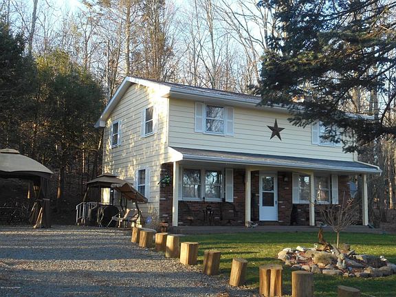 STUNNING REVITALIZED HOME! Original Hardwood floors THROUGHOUT, this spacious home w/ 4 large bedrms, has an eat in kitchen plus formal dining rom, large open living room w/ a wood insert in the fireplace, a first floor powder rm, second floor laundry, and an extremely dry basement that is set up as a family area. BUT THE MANICURED ACRE OF LAND AND THE MOUNTAIN VIEW REALLY SELL IT! Owners have revitalized this home and made it very warm and inviting! PRIVATE LOCATION, close to all Pocono amenities, and only 20 minutes to the Delaware Water Gap for commuting! NO DUES, See Photos, LOW TAXES, A MUST SEE HOME!