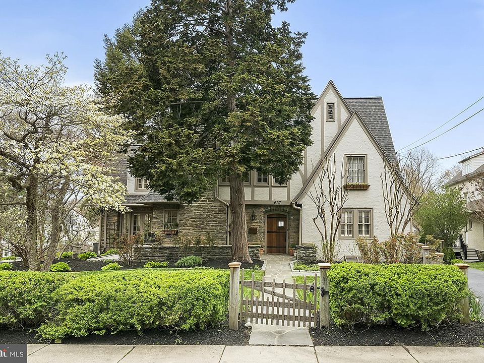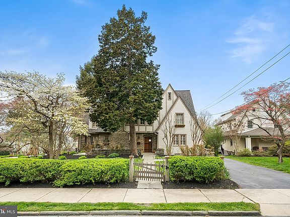 This gorgeous and immaculately maintained 1930 Tudor is the perfect marriage of classic Main Line charm with the comforts of modern updates and amenities. The pristine home sits on a beautiful, professionally landscaped corner lot in an incredibly walkable location, just blocks from two regional rail stations, shopping and dining in downtown Narberth, and the award-winning Merion Elementary School. The first floor of this distinctive home is full of character and charm, with deep window sills, vintage molding, an oversized wood-burning fireplace, a deep entry-hall closet, and original hardwood floors. Through the spacious living room, french doors and walls of windows surround a separate sitting room that would make a pleasant, light-filled office or quiet sitting area. The dining room easily fits a large table with room to spare. Oversized doorways connect the spaces to the wide entry hall, which leads back to a lovely half bathroom tucked under the stairs, and a rear door that exits to a large slate patio. No expense was spared in the amazing chef's kitchen, with features including a six-burner Viking range with commercial-grade stainless Viking hood, built-in Sub-Zero fridge, Bosch dishwasher, ceiling height custom cabinets with matching built-in shelving, banquet seating with granite island/table and under-bench storage, pantry with shelf system, recessed lighting, wet bar, wine fridge, and Scotsman ice maker. The kitchen connects both to the dining room and rear entry hall, providing a circular flow convenient for entertaining and everyday living, and also exits to a second rear patio outside, and a back staircase to the second floor. A luxurious primary bedroom on the second floor has a newer ensuite bath, two big original closets, and an adjoining sitting room that currently serves as an elegant office with windows on three sides. Adjacent to the primary bedroom is a large walk-in closet customized with a closet system. This second floor has two additional bedrooms with respectable closet space and a full hall bath with two linen closets and a walk-in tiled shower. The third floor has two more bedrooms and a full bath with a clawfoot tub. The expansive 1466 square foot partially-finished full basement is clean and dry, with plenty of space for the large recreation room with soft gym flooring, abundant storage areas, wine cellar, powder room, and laundry area with newer high-end appliances. Front and back patios and walkways create wonderful and abundant outdoor living space. Professional landscapers and arborists have meticulously cared for the grounds and trees every season. Hedges and a picket fence surround the front yard, with an invisible fence covering the whole perimeter. The enormous two-car garage could house a vehicle and still serve as the ultimate workshop, and it includes a huge second story loft with tons of possibilities. Outdoor features also include landscape lighting and an irrigation system. Last but not least, is the home's amazing location, close to Philadelphia, but in a beautiful Merion Station neighborhood with sidewalks and tree-lined streets, that feels worlds away! Merion Elementary is two blocks in one direction, and charming Narberth is six blocks in another. Imagine leaving the car at home, and easily walking to school, or the train station, plus restaurants, shops, the movie theater, and all of Narberth Borough's beloved family events and activities. You can have it all, with classic charm, modern updates, easy commutes, and an incredible, walkable location.