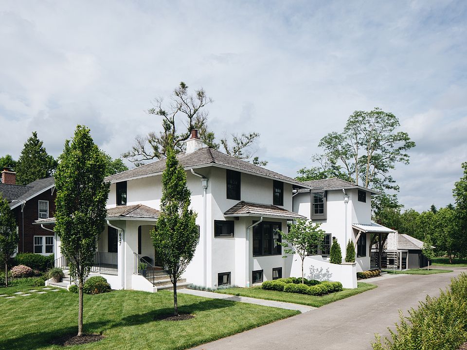 Historical arts & crafts style home Now Available! Stucco exterior with vertical tongue and groove siding accents and exposed roof rafter tails. A two story glass stair gallery overlooks a private walled garden courtyard which adds elegant comfort to this distinctive home. The house is situated on an oversized village lot within walking distance to downtown Barrington and Metra Station.