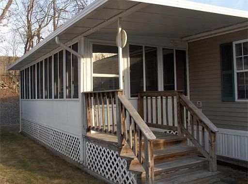 Over 1200 sq ft of living area in this double wide at Riverview Estates Mobile Home Park for adults age 55+. Large open cathedral ceiling living room, open to dining, with light color laminate flooring and ceiling fans. Lots of cabinets in the sunsplashed eat-in-kitchen with wraparound windows adjacent to dining. Appliances, including stack washer and dryer included (except no dishwasher). Master has laminate floor, master bath with both shower and tub. Second full bath and second bedroom with wall to wall carpeting. 22 x 10 three season porch, currently arranged with storage area, or open it up to its full size. Storage shed. Easy to show, quick close possible. Don't delay!