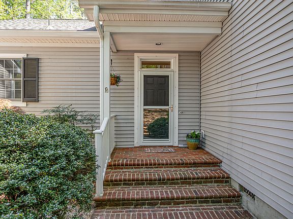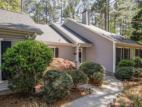 One of the most beautifully landscaped homes in Fearrington Village. This single- level, three-bedroom home, with two-car garage and exceptional floorplan boasts the benefit of a private, wooded setting. Positioned on almost an acre, multiple gardens connected by winding paths are found nestled in the woodland. Once inside the home, natural light and views of the beautiful surrounds are enjoyed through large windows and glass doors. An ample foyer greets guests. The living room boasts built-in shelving and one of the home's two gas log fireplaces. Next to the living is a large, country kitchen that includes a family room area with the home's second gas log fireplace. The updated cook's kitchen has abundant cabinetry, granite counters, an island with seating area, and a breakfast nook. The deck and screened porch are accessed from the family room. At the back of the house is the spacious primary bedroom suite. The suite has an updated bath with large shower, dual sink vanity, and generously sized walk-in closet. Two additional bedrooms, a full bath and an office are found at the front of the home. These rooms being located at the end of a hallway offers the option of private guest quarters. Additional features of the home include recessed lighting, a laundry room with sink, many closets, storage options in the expansive walk-in crawl space, newer and well-maintained systems, a newer roof, and a whole house dehumidifier.
